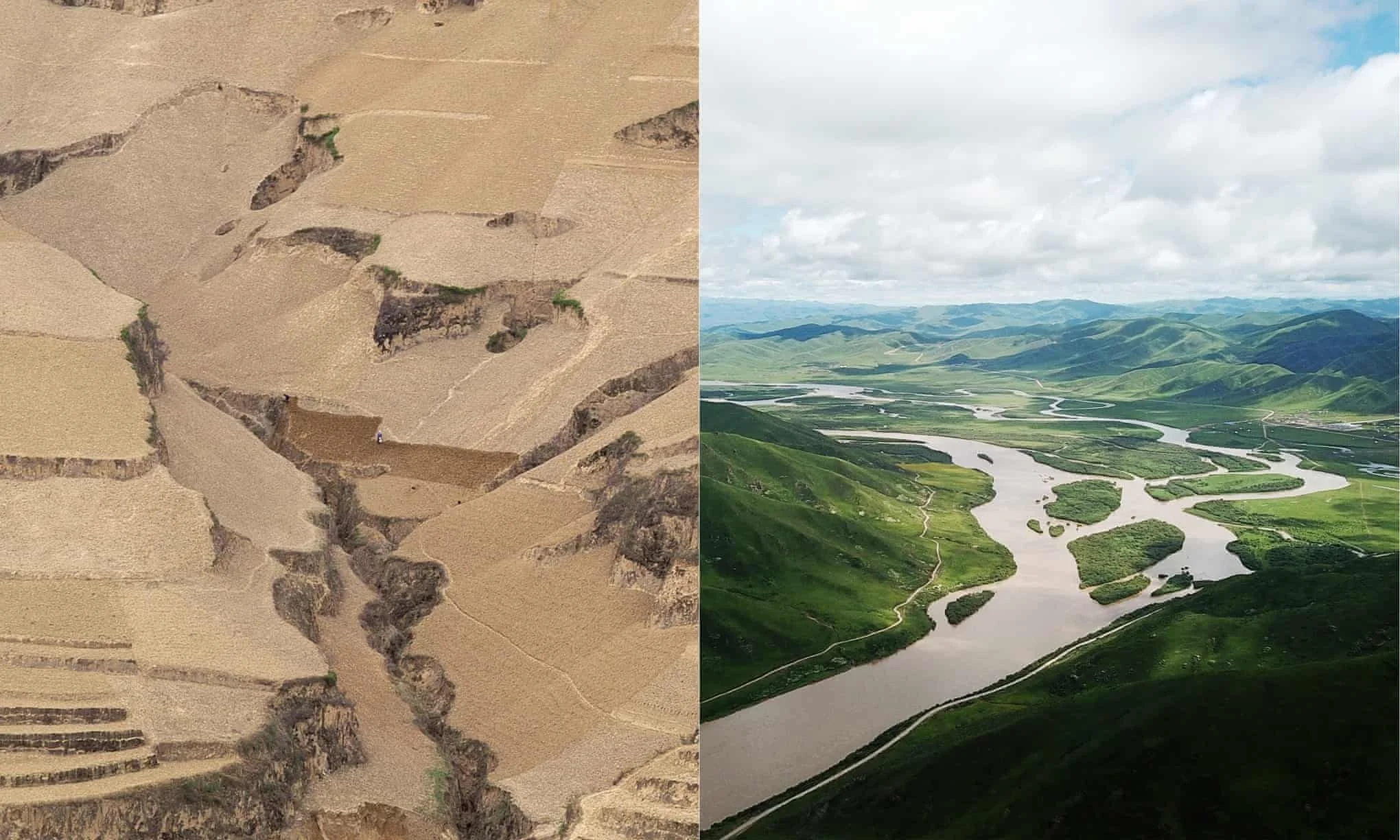 The Loess plateau, in China, in 2007, left, and transformed into green valleys and productive farmland in 2019. Composite: Rex/Shutterstock/Xinhua/Alamy